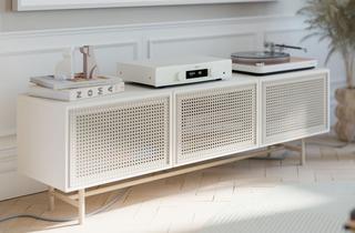 H150は横幅43cm、奥行き35cmというコンパクトな設計で、さまざまなシェルフやキャビネットに設置しやすいよう設計されている。厚みのある精密切削アルミニウム製フロントパネルと穿孔スチール製トップカバーがモダンな外観を演出している。