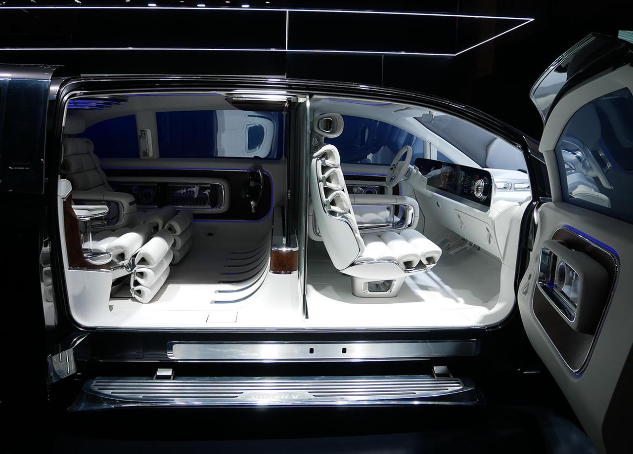 東1ホールのメルセデス・ベンツブースには、「VISION V」と書かれた車内エンタテインメントのコンセプトカーが展示されていた。ドライバー席と後部座席の間に30cmほどの間仕切りがあり、映像作品を楽しみたい場合には、そこから65インチディスプレイがせり出してくる仕組みだ。