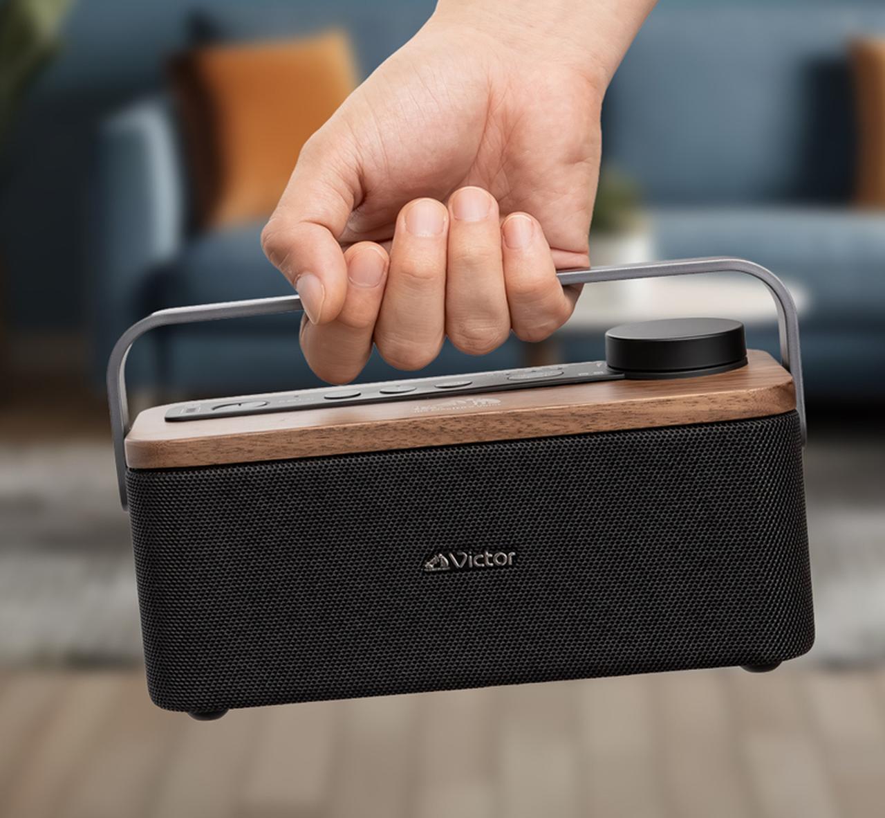 MDFウッドキャビネットと2ウェイ・スピーカー構成により、小型ながらクリアーな中音域と、豊かな低音を実現した。さらにBluetooth機能の搭載により、スマートフォンから音楽再生も高音質で楽しめるという。スピーカー部の天板には天然木を、折り畳めるハンドルにはアルミ素材を採用し、上質で機能的かつ、インテリアになじみやすいデザインに仕上げている。