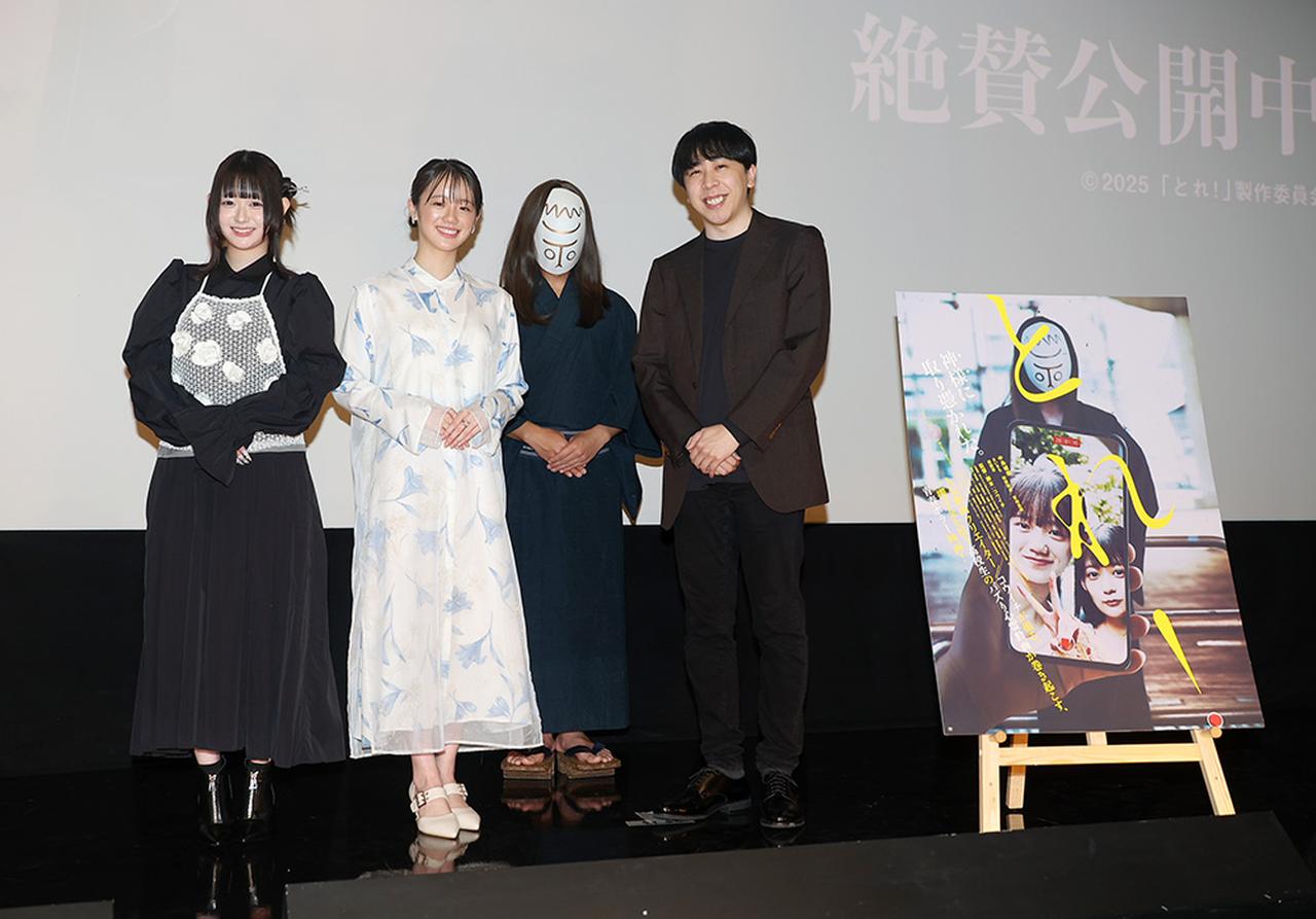 動画クリエイター・コウイチが監督・脚本を務めた初の長編映画『とれ!』の全国公開が1月16日より始まった。同日、都内で公開記念舞台挨拶が行なわれ、コウイチ監督をはじめ、主演の中島瑠菜、共演のまいきち、さらに劇中で中島瑠菜演じる主人公・美咲に取り憑く、和服姿にお面を付けた“神様”も登壇。公開初日を迎えた心境や撮影時のエピソード等をきくことができた。