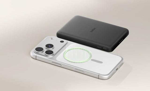 Belkin BoostCharge 薄型マグネット式モバイルバッテリー5Kは、5000mAhという大容量を備えながら、厚さ10.6mm・重さ119gという超薄型設計を実現したマグネット式モバイルバッテリー。 10N(約1kgの荷重に耐える)の強力な磁力により、最新のiPhoneにも吸着し、安定したホールド感で写真撮影や操作を妨げない。