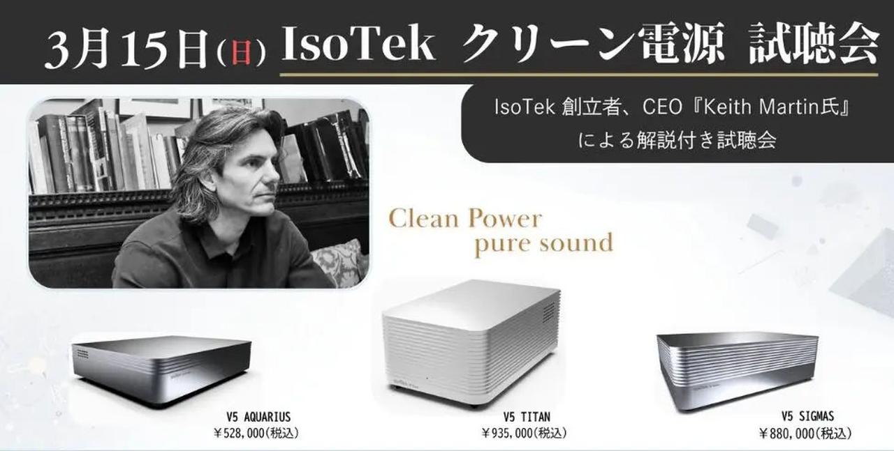 ナスペックでは、イギリスIsoTekのクリーン電源の効果を体験できる試聴イベントを、福岡と大阪で開催する。同ブランドの人気モデル「V5 AQUARIUS」「V5 SIGMAS」に加え、ハイエンドモデル「V5 TITAN」を用いた比較試聴が予定されている。