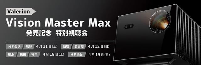 ホームシアター専門店のアバックは、国内唯一の販売店として、プロジェクターValerion「Vision Master Max」の販売を3月27日 (金)より開始した。この発売記念として、全国8店舗にて4月11日 (土) ~4月19日 (金) にかけて特別視聴会を開催することとなった。