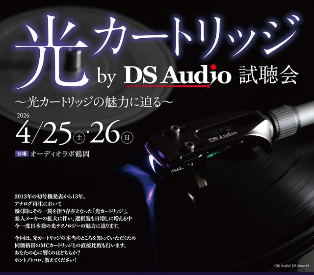 DS Audioは今週末、4月25日(土)、26日(日)の両日、山形県鶴岡市にあるオーディオショップ「オーディオラボ鶴岡」にて、光カートリッジの試聴会を開催する。