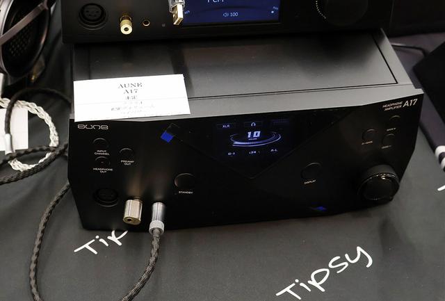 aune audioからは、ようやく実働のポータブルヘッドホンアンプ「BX2」が到着。管球式(Nutube)で、天面(?)のくびれた部分からNutubeが見えるようになっている。加えて、デスクトップラインSシリーズの上位となるAシリーズ(フラッグシップ)のヘッドホンアンプ「A17」も参考展示されていた。幅はSシリーズ並みながら、厚みと奥行が増しており、ハーフサイズコンポといった趣。DACレスのアナログアンプで、ボリュームはR2Rになるそうだ。価格・発売時期は未定ながら、予価は3000ドル相当という。