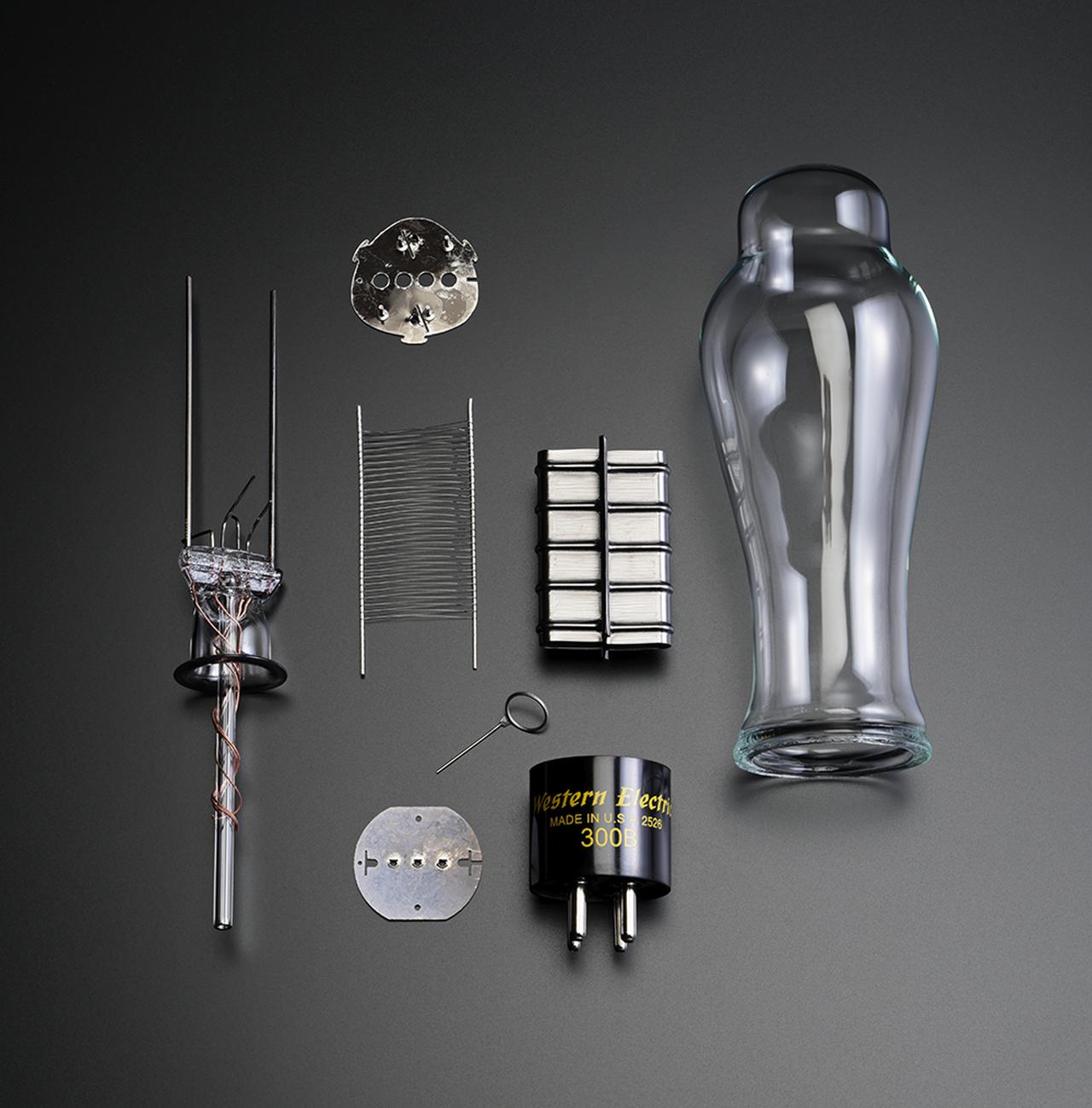 画像: 最新WE300Bの電極。吊り構造のフィラメントと「おむすび型」のマイカ板形状が見て取れる。渋めのシルバーの光沢を持つプレートは先端素材であるグラフェンでコーティングされている。本ページのメイン写真が構成パーツ類だ。